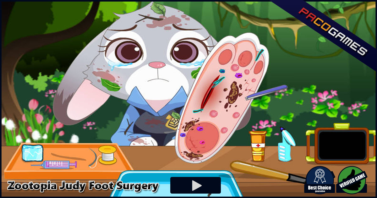 Judy from Zootopia fell on the ground while she was walking in the park. Now she is injured and cannot walk. Be so kind and help her to relieve pain by taking care of her. Luckily, you are able to provide first aid, so we do not have to take her to a hospital. Remove all wounds and make her happy by giving her some of your own clothes. You see? She is now so much more cheerful. Have fun.
