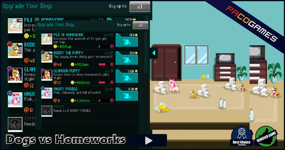 Sigh! You have a homework for tomorrow... You must get an A, else your mother will be angry and she will make your day total hell. You do not have nerves for this, so lets work on your school tasks hard. Wait a second! You could call your good friends dogs to help you out. They will help you with your homeworks and you will have more time to go out with your friends or to play some games. Yeah, that is a good idea! Have fun.